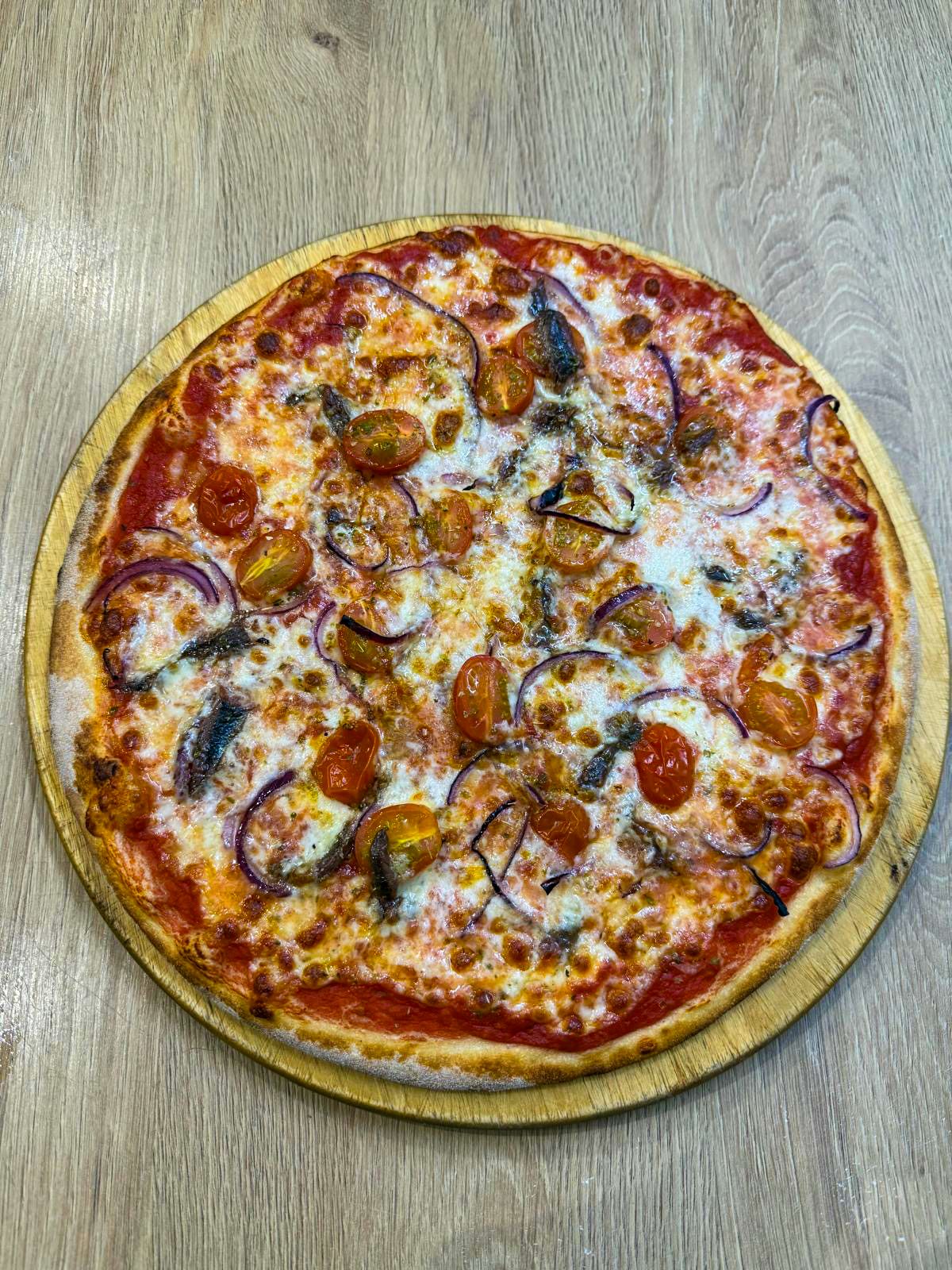 sos pomidorowy, mozarella, pomidorki koktajlowe, czerwona cebula, anchois
